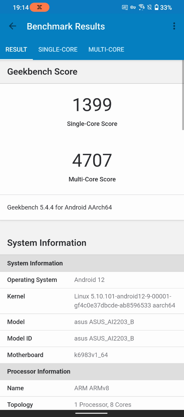 GeekBench5测试中,ROG6天玑至尊版拿下了单核1399分、多核4707分的好成绩。再次刷新了安卓手机阵营中的分数上限,无论是单核还是多核成绩,相比高通骁龙8+Gen1都有了较为明显的提升。