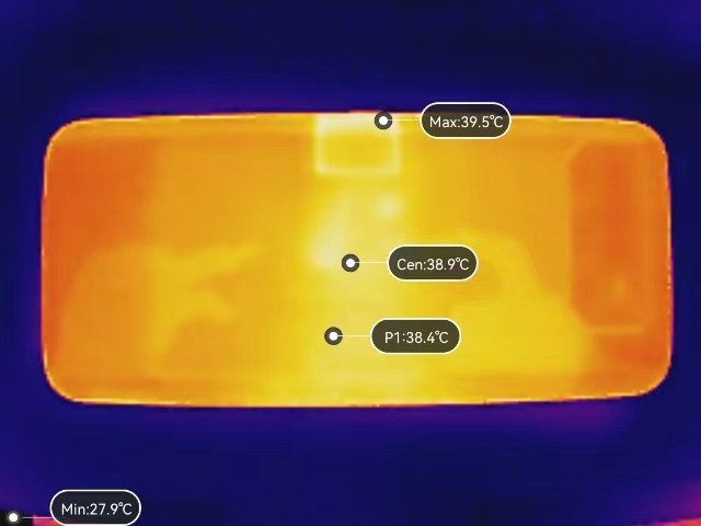 在运行《使命召唤手游》时,手机背部的最高温度为39.5℃,位置为酷冷风动阀处。由此可以看到,酷冷风动阀的确有着不错的散热效果。