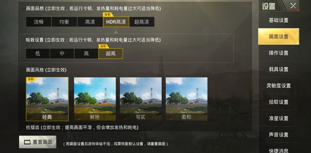 接下来看看对手机硬件要求较高的《绝地求生:刺激战场》,在设置中开启“HDR高清”和“超高帧数”,其他选项保持默认。这款游戏也是经过GPU Turbo技术优化的,结果又如何呢?