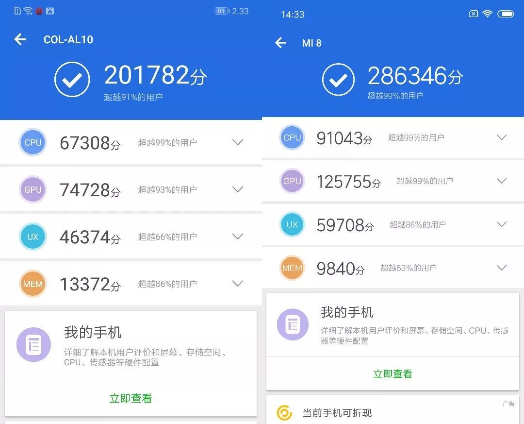 安兔兔跑分成绩对比(左为荣耀10,右为小米8)