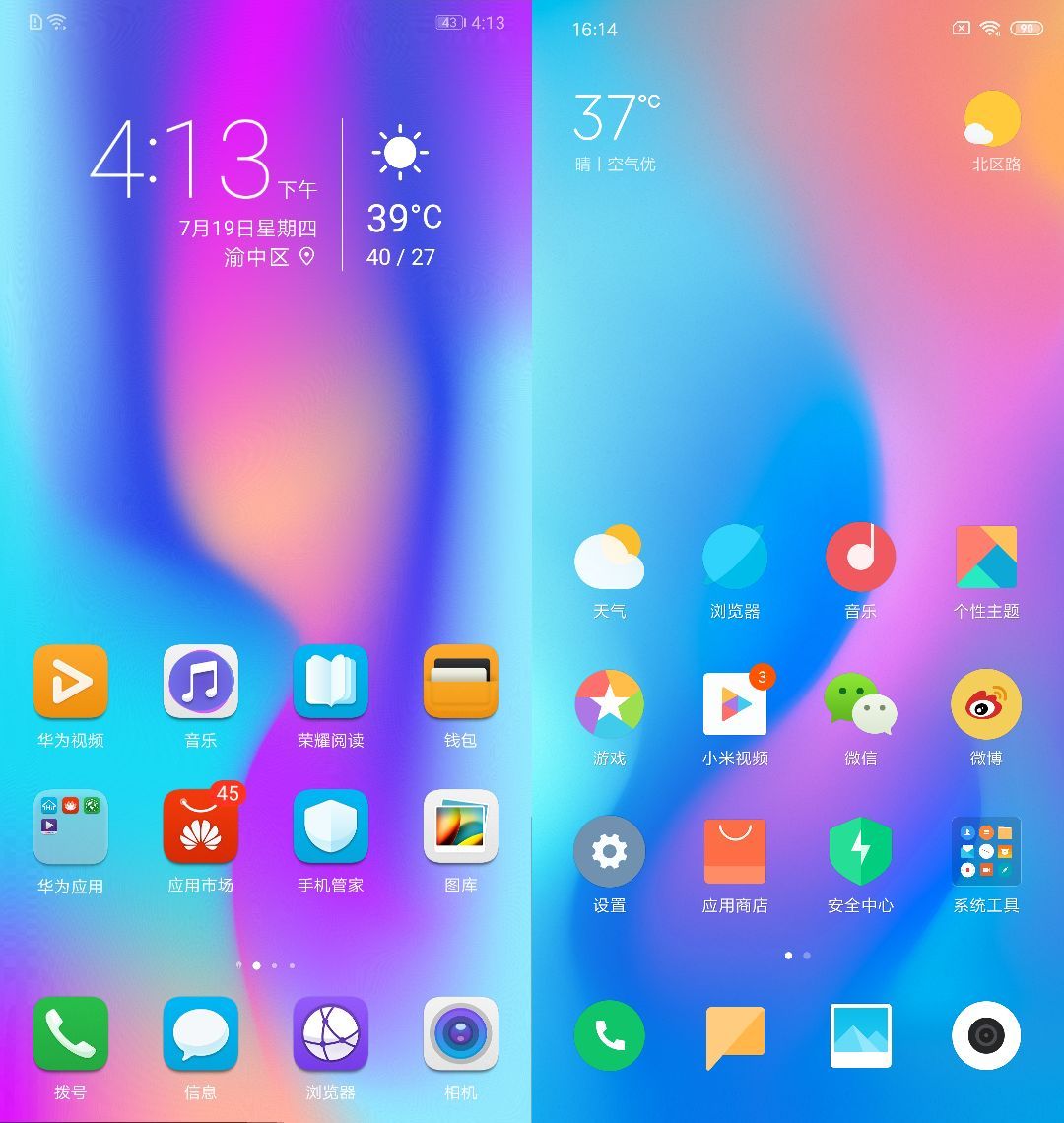荣耀10与小米8系统UI对比(左为荣耀10,右为小米8)