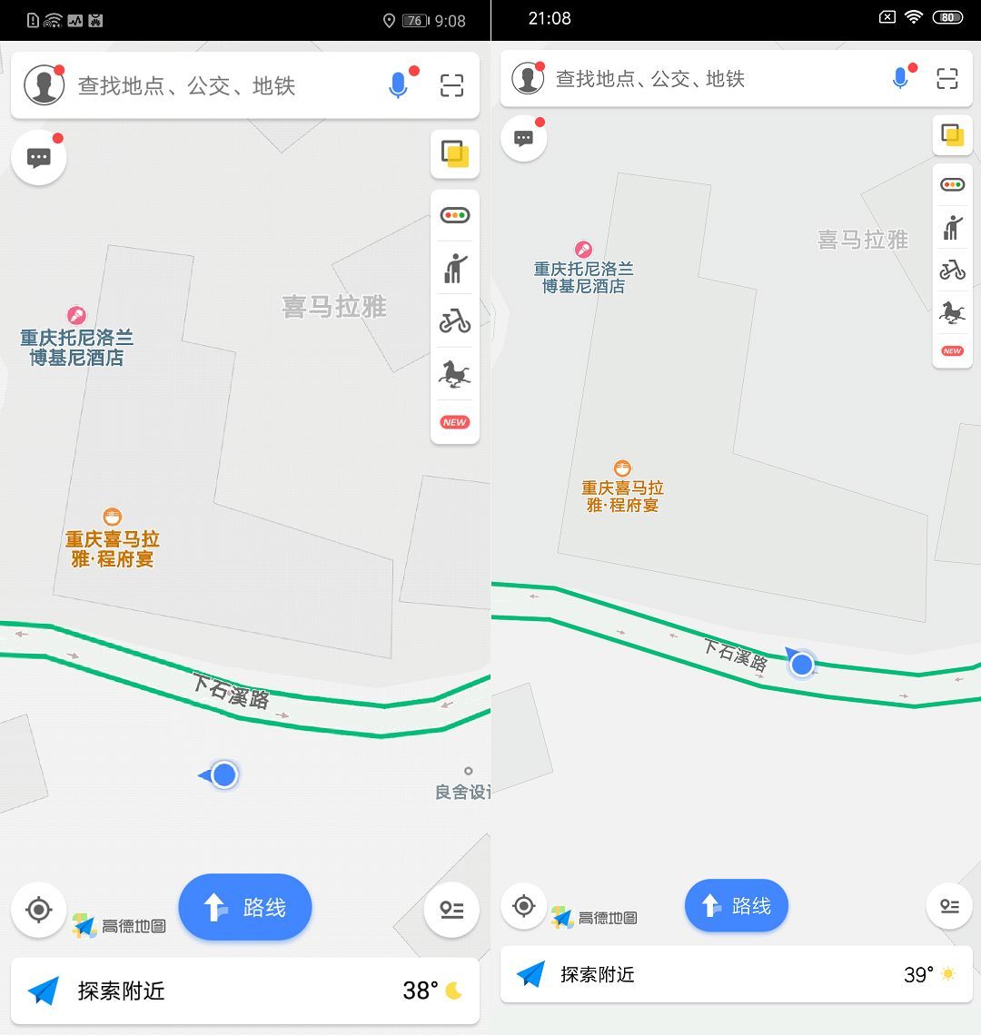 一般来说,最常用到GPS的就是导航。我们用高德地图进行了实际测试,两款手机在户外,特别是公路上定位都比较准确,误差很小,在重庆的“8D立交桥”黄桷湾立交桥上也没有迷路。
