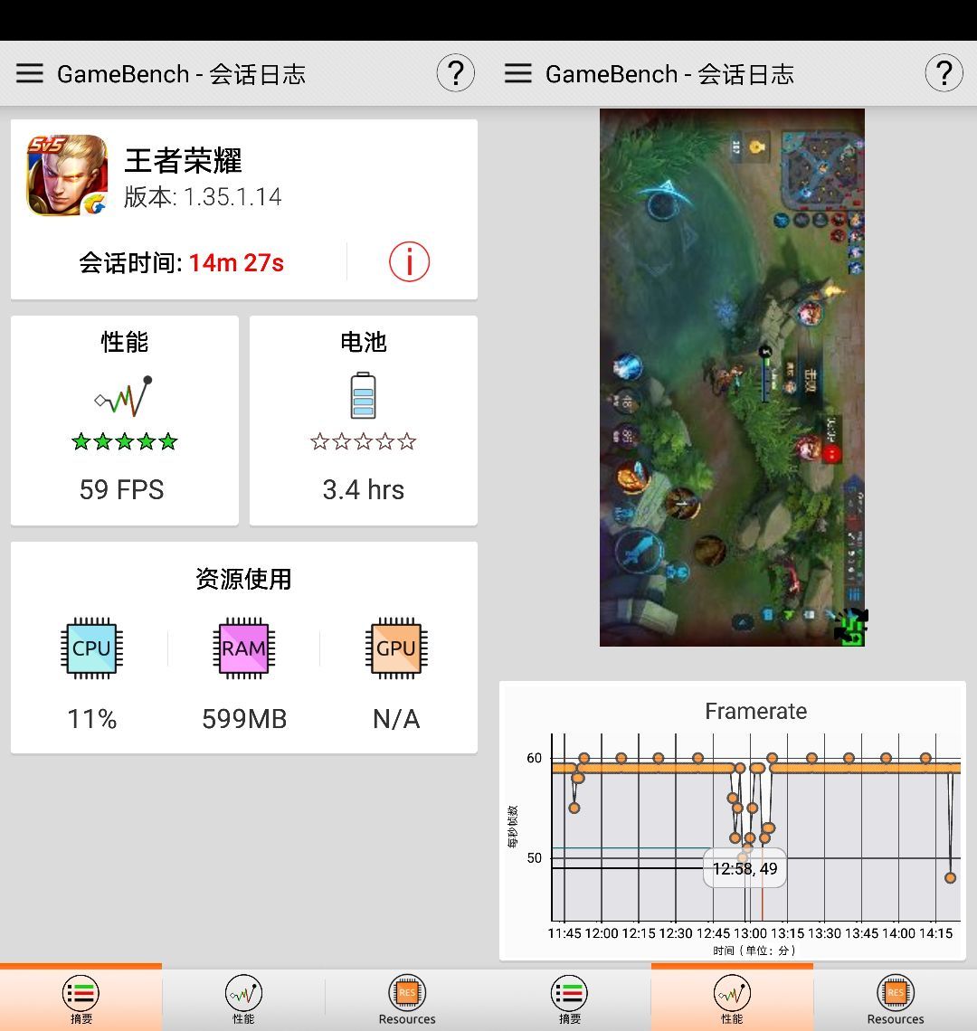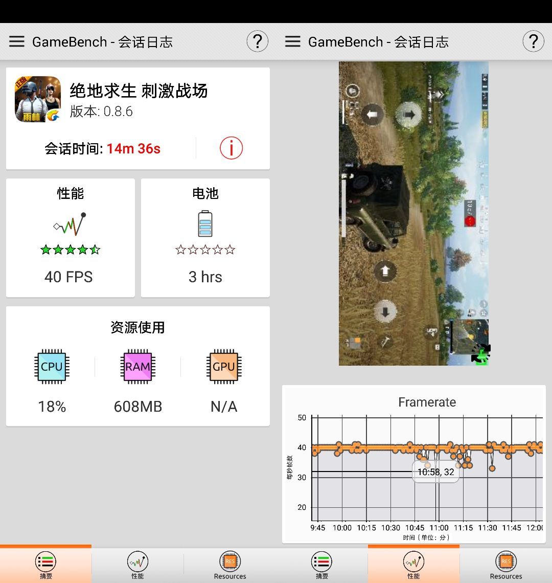 在接下来的测试中,两台手机连接同一个WiFi,保证不受网络干扰,并且均开启游戏加速功能,先试玩半小时“预热”,让手机达到满载状态。在后台登录微信、QQ等常规APP,模拟用户的正常使用环境,然后开启GameBench记录游戏数据。