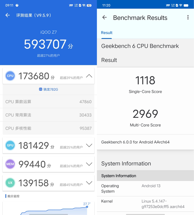 在考验长时间性能稳定性的3D Mark压力测试中,iQOO Z7持续20分钟连续不断高负载输出,最终得到了800+的循环分数,稳定性更是高达99.6%,这应该也是得益于中端处理器的低功耗,机身不发烫,自然不会降频了。