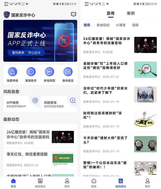 我们在帮助长辈完成用户身份认证后,“国家反诈中心”App还可用于检测社交和支付账号风险,包括许多相关的曝光骗局、新闻资讯等,这权威性不比朋友圈四处转发的小作文强?