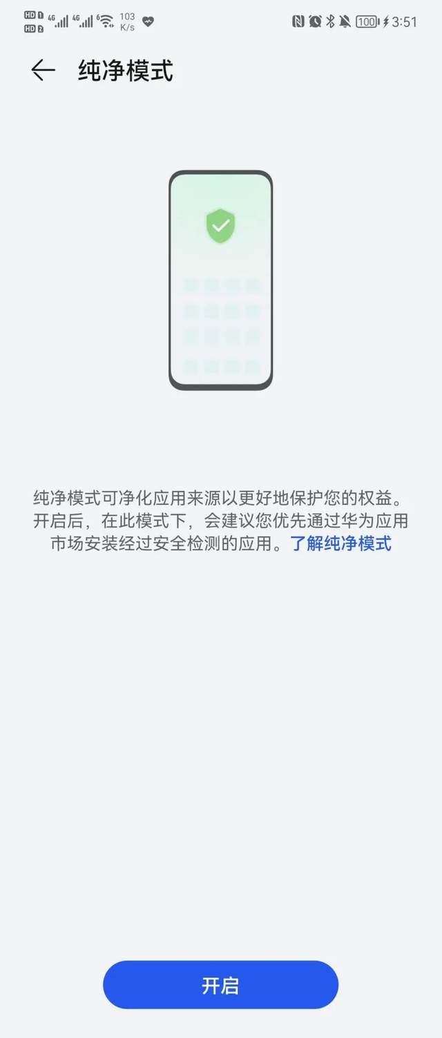 以华为手机为例,你可以在设置—系统和更新中找到一个名为“纯净模式”的开关,开启之后手机只能安装从华为应用市场下载的App,其他渠道下载的则一律拒绝安装,从根本上解决了源头问题。其他品牌的手机也有类似的功能,iPhone由于是闭环生态,只能从AppStore下载软件,所以本身就不用担心类似的问题。