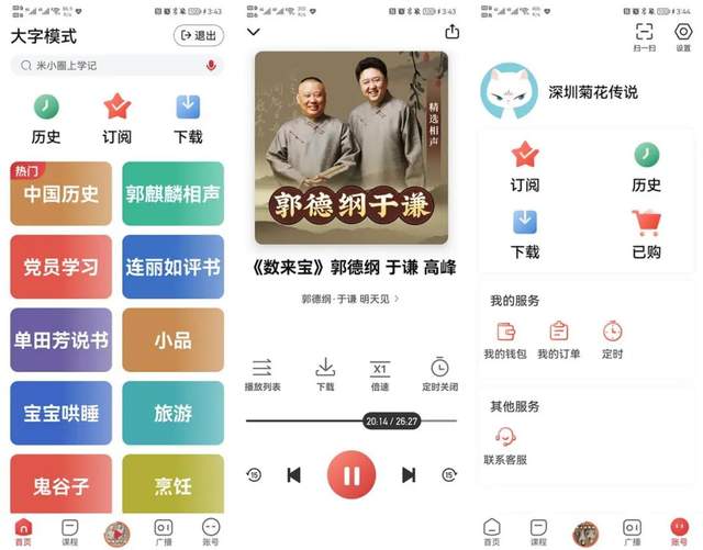 也有一些常用App适老化做得好的,例如喜马拉雅,对于喜欢相声、说书、戏曲的长辈来说是一个值得安装的应用。它在原有App的基础上做了大字模式,在搜索框中输入大字模式即可开启。
