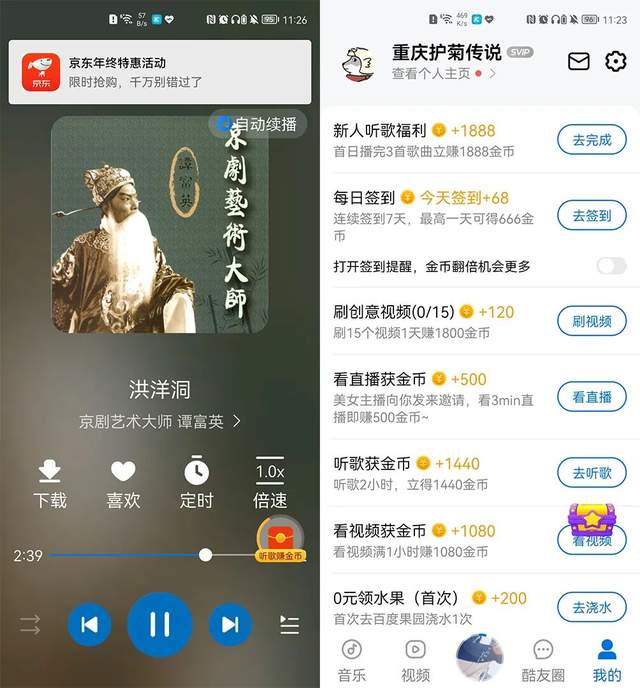 不过它其他方面做得就没有那么纯粹了,“视频”集合了视频、短视频,而且还有登录领钱的引导性链接,酷友圈则类似微信的朋友圈,“我的”则是各种奇怪的打卡领金币的任务。另外,在音乐播放界面,偶尔也有电商广告弹出。如果遇到这些内容,直接无视即可。