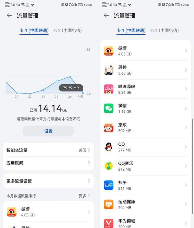 其次是流量管理,这也是家人,特别是老人需要注意的点。好在手机预置的手机管家都有流量管理功能,用系统自带的即可,没有必要单独下载。而且除了流量使用情况,父母还能看到每个App消耗的流量,一目了然。