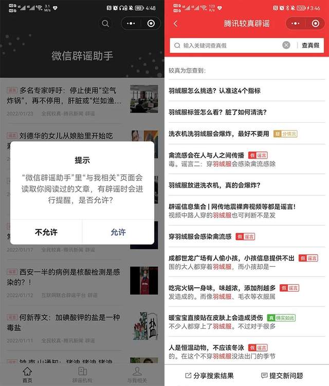 父母或长辈在使用微信辟谣助手是选择允许读取,小程序会自动扫描用户阅读的公众号文章,查看是否为谣言。但如果要搜索一些谣言,建议父母或长辈使用腾讯较真辟谣,因为这个小程序会对搜索出的谣言结果添加标签,结果一目了然。