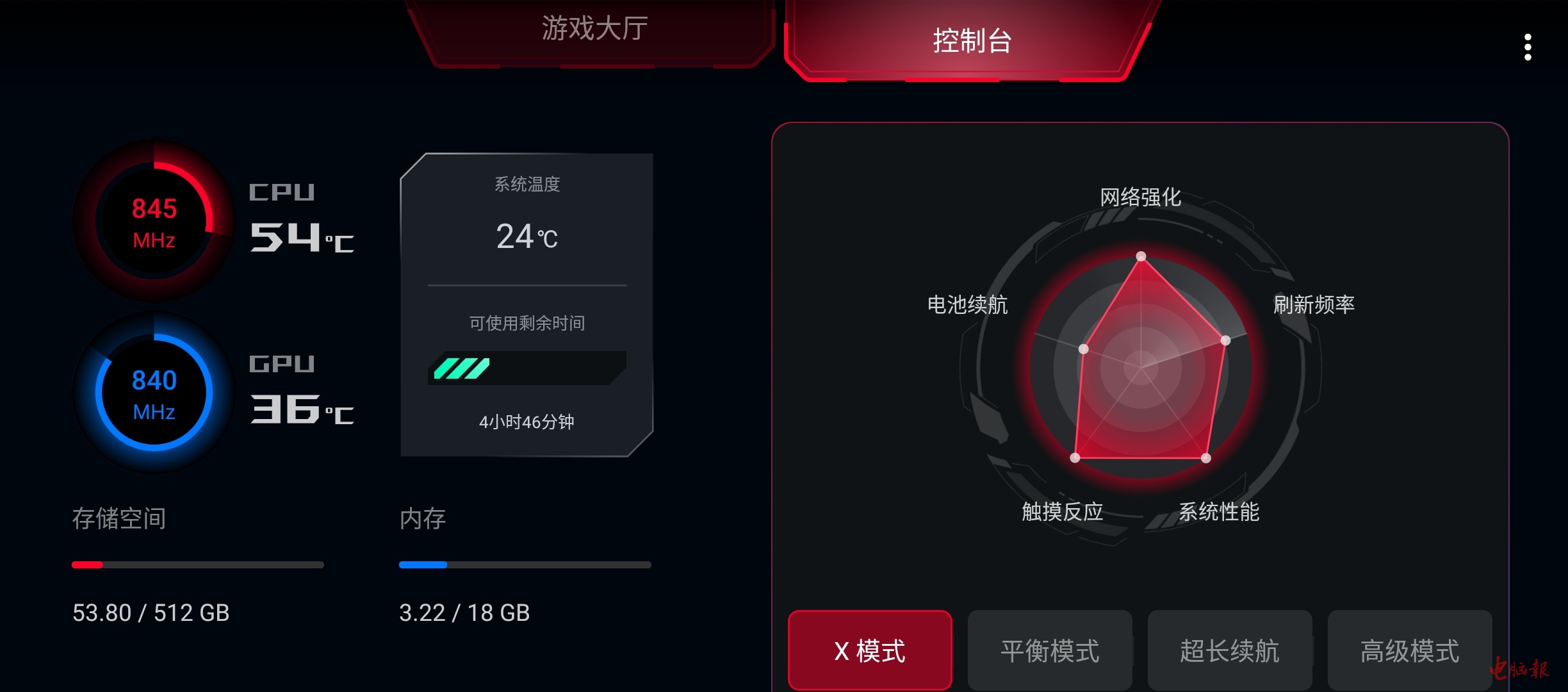 新一代的ROG智控中心由游戏大厅和控制台两部分组成,玩家可以根据不同的使用场景和游戏需求,像控制PC一样控制手机的处理器性能。需要高性能时,玩家可以打开X模式,手机将获得更强的性能释放,而在玩家接入酷冷风扇5后,玩家还能开启更加暴力的“X+”模式,获得更加极致的性能释放。