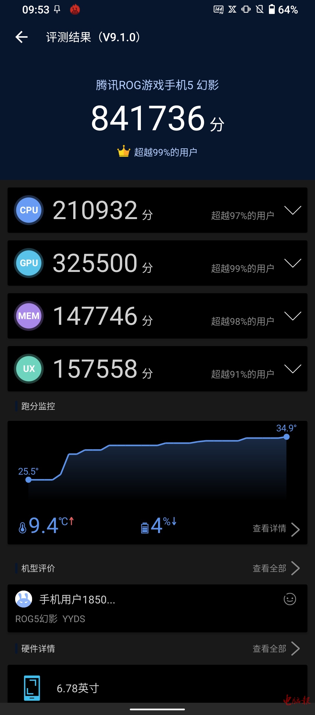 鲁大师测试成绩为942005分,其中处理器成绩和之前ROG游戏手机5差别不大,内存分数则提高了不少。