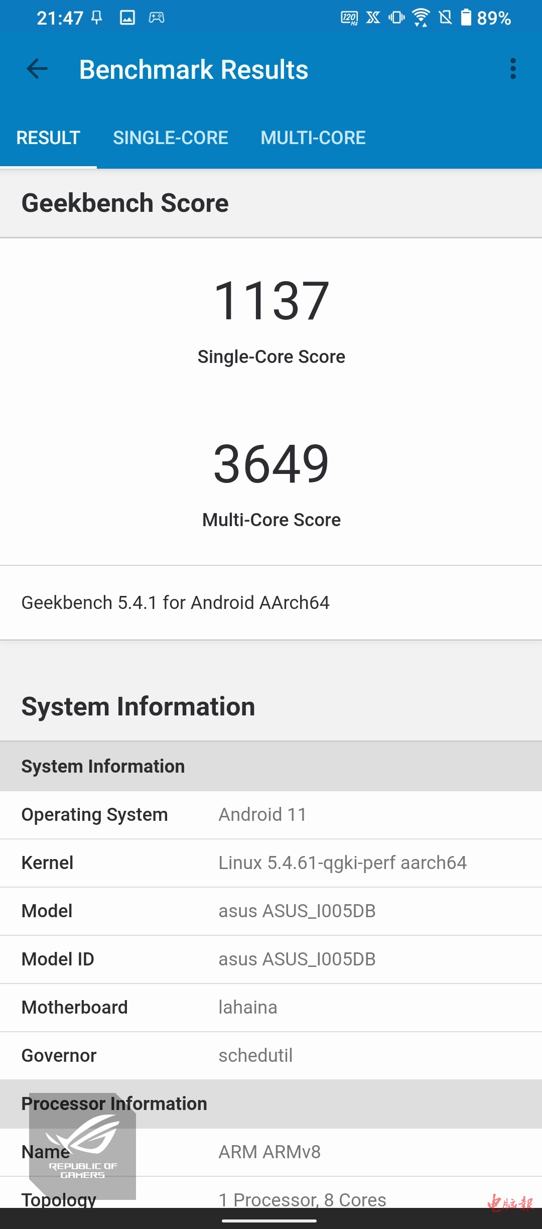 Geekbench5测试中,腾讯ROG游戏手机5s Pro的多核得分为3649分,多核方面高通骁龙888 Plus和骁龙888的表现比较接近。而单核成绩则达到了1137分,相比骁龙888小有提升。