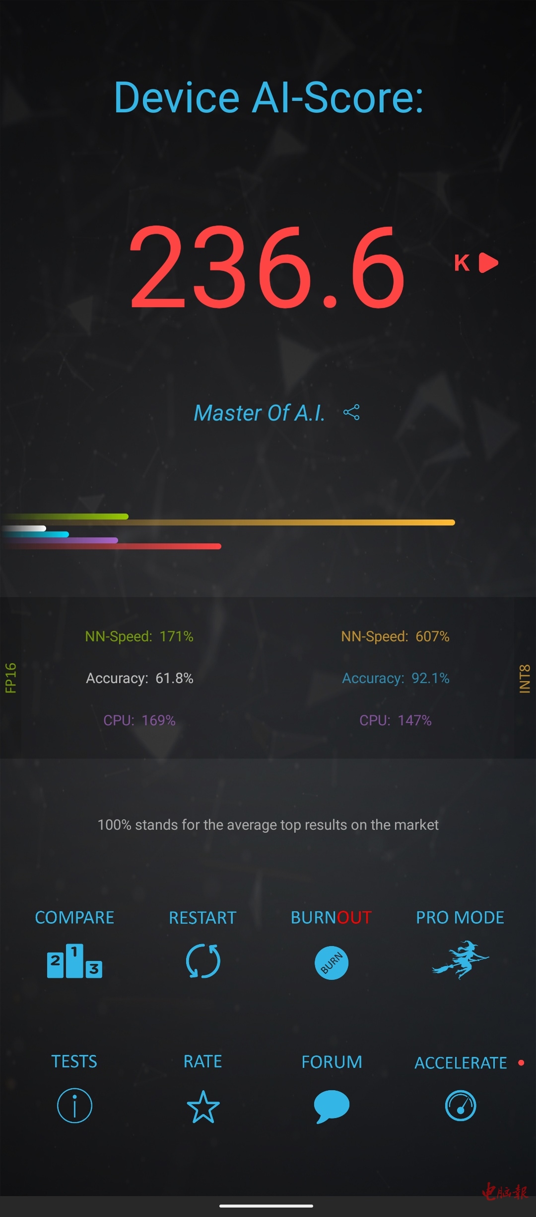 AI benchmark考验手机的AI运算性能,腾讯ROG游戏手机5s Pro的得分高达236.6,比搭载骁龙888 Plus的普通手机成绩还要高出一截,已经是当下最顶尖的档次,之前骁龙888的得分通常在140上下,提升让人惊讶。