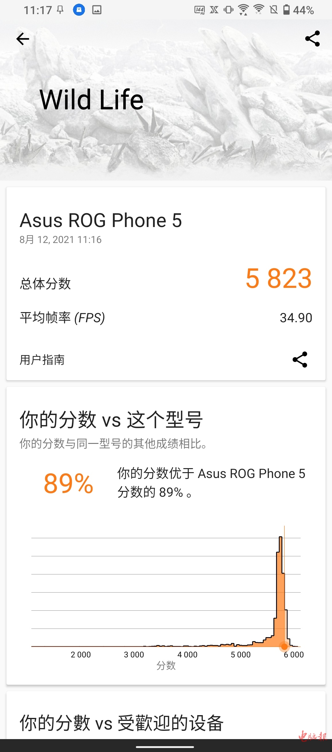 老牌跑分软件3DMARK测试中,Wild Life项目的得分为5823,相比之前骁龙888机型的得分提升不大,这主要是因为骁龙888 Plus GPU的频率和性能没有变化,所以3DMARK的成绩也不会有太大差距。
