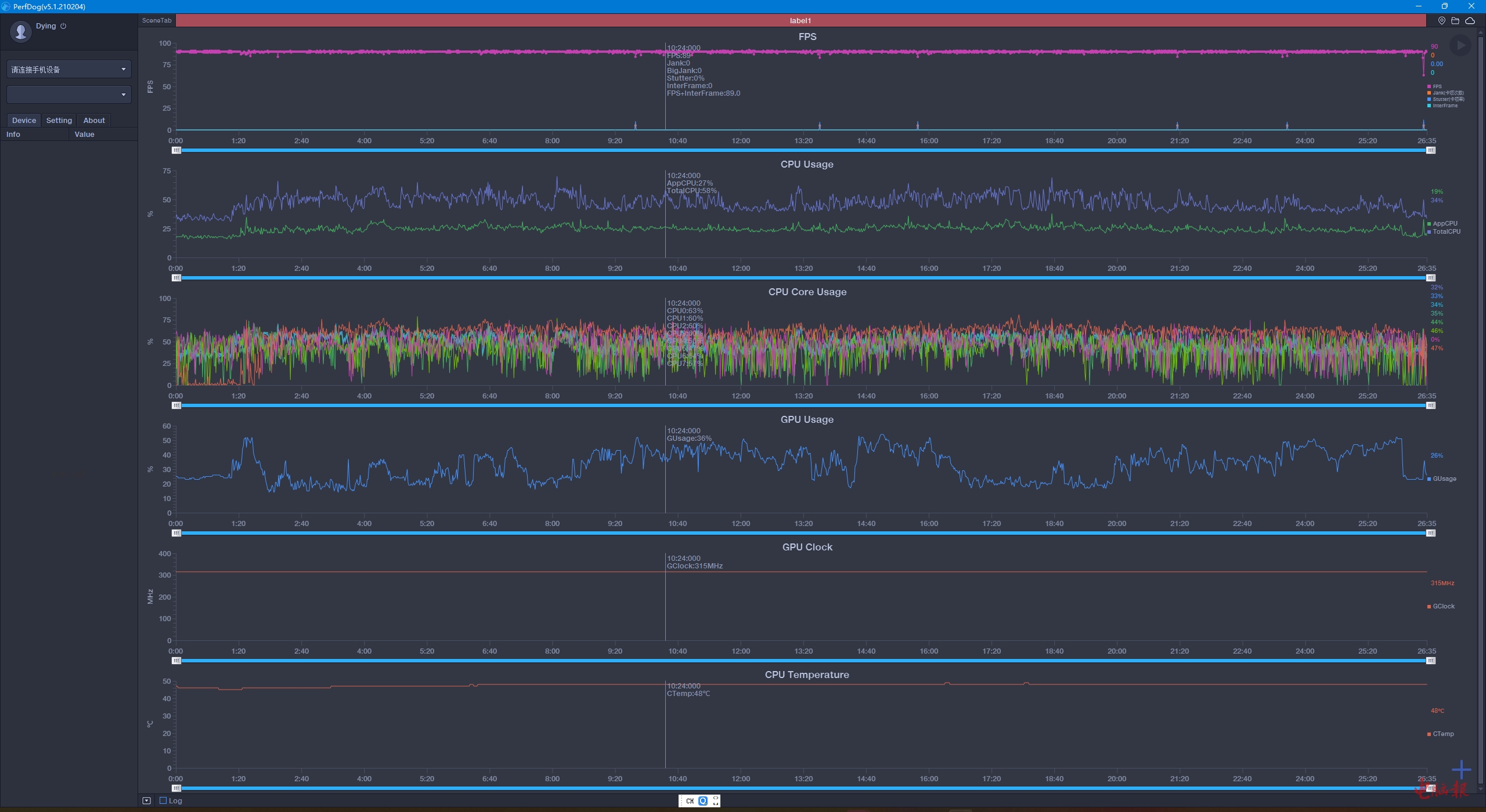 《和平精英》已经给腾讯ROG游戏手机5s Pro适配了90fps模式,所以测试在90fps模式/流畅画质模式下进行,测试时打开手机的“X模式”。从测试来看,该手机能够实现89.7fps的平均帧率,偶有波动也不会低于80fps,全程无卡顿,游戏过程流程顺滑。同时也可以看到,处理器频率全程不到2GHz,压力非常小,骁龙888 Plus用来玩《和平精英》这样的游戏性能还是有不少溢出的。