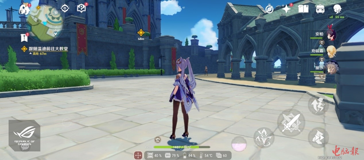 最后再来看看次世代3A大作《原神》的表现。它对手机性能的需求可以算得上是“变态”了。我们使用最高画质/60fps的设定连续进行了一小时的游戏。在测试时,我们启用腾讯ROG游戏手机5s Pro的“平衡模式”而不是“X模式”。