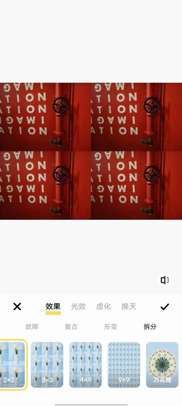 另外一个变化较大的点是相册功能。打开vivo X90s的相册,点击“特效”,会发现新增了一个“效果”菜单。这里提供了多种照片处理效果,包括故障、变形、万花筒等,而且能与其他特效、滤镜相互叠加。