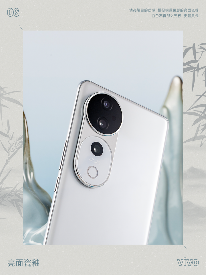 vivo S19系列这次带来的烟雨青、桃花扇的全新配色,将传统瓷器、扇面的工艺融入到机身设计之中。烟雨青借鉴了素胚制瓷的工艺,用玻璃模拟出瓷器釉面的质感。这种特殊的质感,让白色手机不再显得呆板和无趣。就如同亮面瓷釉一样,呈现出了一种玉质的温润感和光泽感。