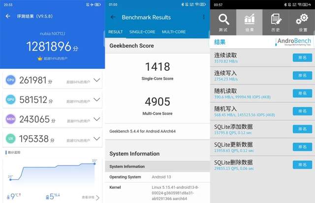 努比亚Z50 Ultra搭载了第二代骁龙8,LPDDR5X+UFS 4.0内存组合,理论跑分如下图所示,属于第二代骁龙8旗舰机的正常水平。