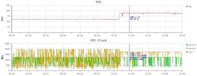 从帧率前后变化可见,当在60fps(即插帧后120fps)下运行时,游戏中的帧率波动情况很少,由于负载更低,3颗大核充当了性能输出主力。