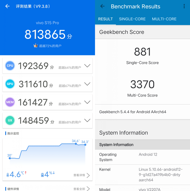 既然如此,那更有必要来看看S15 Pro给出的天玑8100+独显芯片Pro的搭配效果了。首先是跑分方面,属于正常水平:安兔兔平台81万;GeekBench 5:单核881,多核3370。得益于天玑8100,S15 Pro的多核性能已经看齐了自家大哥(骁龙8版的X80 Pro)。