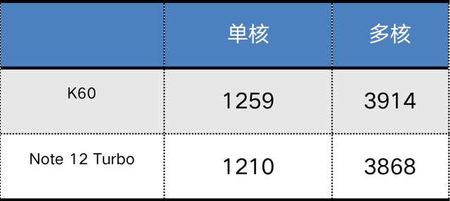 Geekbench5平台,Note 12 Turbo在单核与多核性能表现上都跟之前的Redmi K60比较接近。K60的骁龙8+平台在分数上与Note 12 Turbo相比有轻微的优势。综合看来,这样的跑分成绩也跟骁龙7+和骁龙8+两款平台在配置上的差异基本吻合。