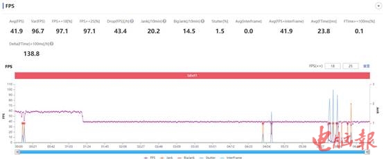 通过帧率监测可以看到,虽然一开始达到了60fps的平稳帧率,但仅仅坚持了1分钟之后,就被强制降频到了40fps,并一直维持在该帧率下运行,没有掉帧或卡顿,观察CPU占用,会发现整体核心运行都还是比较平稳的,没有大起大落的现象。
