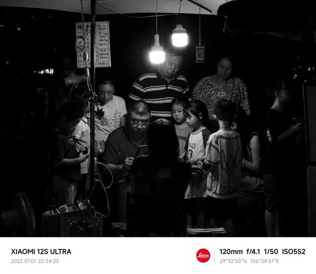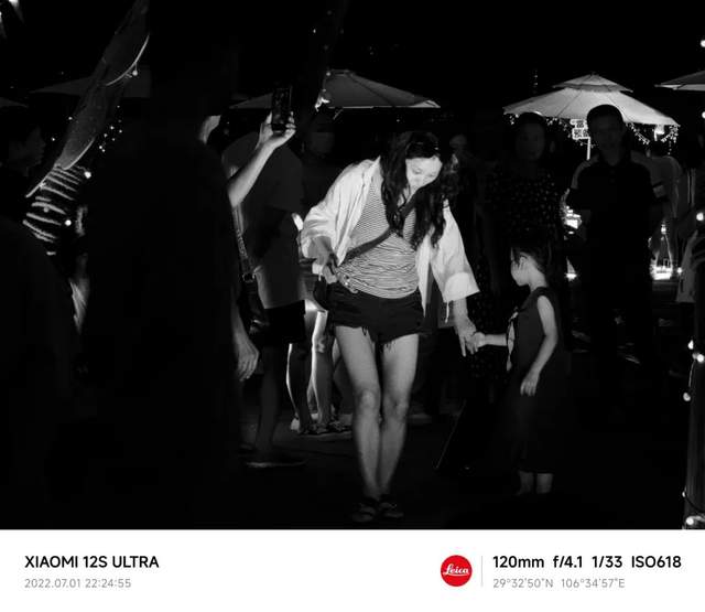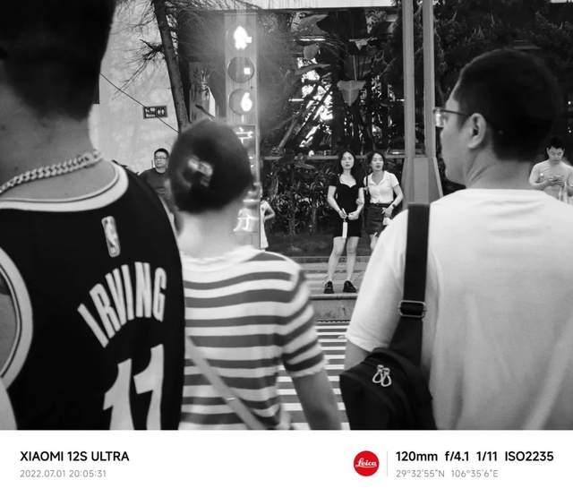 事实上,我更喜欢这次小米12S Ultra的两款徕卡黑白滤镜。众所周知,黑白同样也是徕卡的标志性色彩。上图是我在街边抓拍的一组场景,利用黑白的独特影调风格,小米12S Ultra排除了画面中的冗余色彩信息干扰,将观众的视觉中心引导到画面中每一位人物生动的表情上。借助徕卡黑白色的本身的高对比度和类似黑白胶片的颗粒感,让整个样片增色不少。