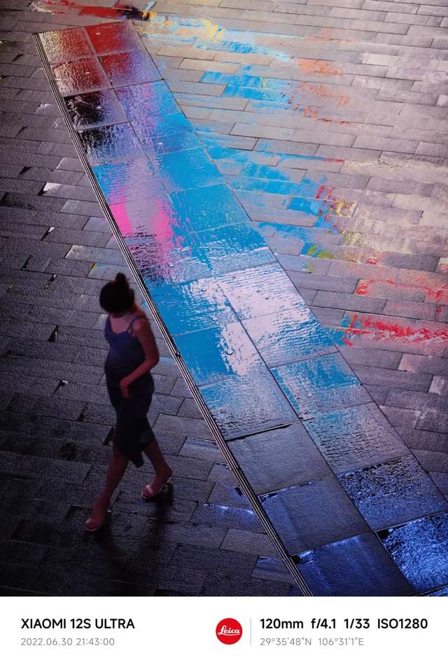 这种良好的色彩呈现能力,不仅仅体现在单一色块的场景中。面对这种多种冷暖色彩的衔接,夹杂着明暗光线的复杂场景时,小米12S Ultra依然能够带来稳定精确,同时又自然迷人的色彩还原能力。在上图这种雨天环境下,地面的积水反射出来的霓虹灯的微弱色彩,就如同油画颜料层层涂抹上去的一般,有种“打翻了颜料桶”的感觉。