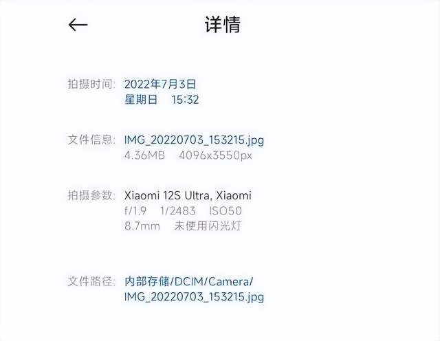 查看这次小米12S Ultra的主摄图片EXIF信息可以看到,其主摄的物理焦距为8.7mm左右。简单按照1英寸CMOS的2.7的转换系数来推算,其理论的等效焦距大致为23.49mm左右。主摄样片中的水印信息显示,其主摄的等效焦距恰好也是23mm,与推算的理论值基本吻合,这证明小米12S Ultra的确是名副其实的一英寸大底。