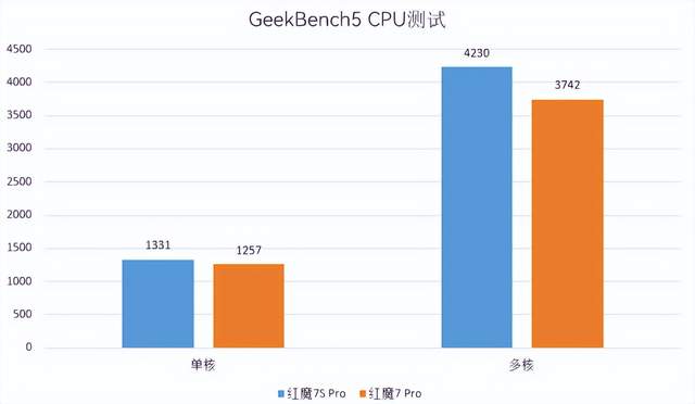 在测试CPU性能的GeekBench 5测试中,红魔7S Pro单核分数1331,多核跑分4230,属于骁龙8+的正常水准,对比红魔7 Pro的单核1257分,多核3742分提升明显。