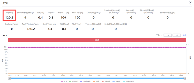 低负载游戏我选择了《王者荣耀》进行测试,最高画质和帧数,开启均衡模式和标准GPU渲染。红魔7S Pro支持120帧模式,平均帧数120帧,平均功耗仅4.9W,帧数曲线几乎一条直线,全程稳定120帧。