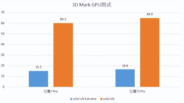 在测试GPU性能的3D Mark中,红魔7S Pro的Wild Life跑分高达10816分,平均帧数64.80帧,红魔7 Pro为10029和60.20帧。红魔7S Pro Wild Life Extreme帧数16.60帧,红魔7 Pro为15.2帧。