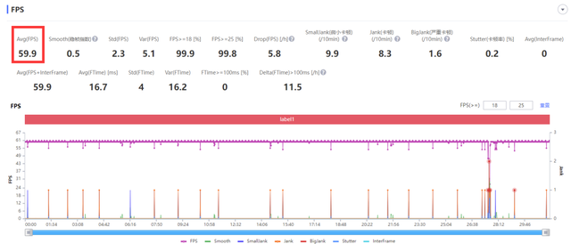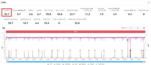 红魔7S Pro平均帧数高达59.9帧,更离谱的是,除了读取场景为0帧之外,整条帧率曲线极少没有出现波动和卡顿,包括容易出现波动的战斗场景,基本是60帧跑完测试流程。