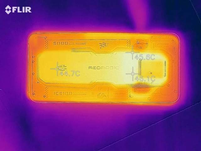 机身最高温度出现在背面摄像头处,为46.1℃,这个温度不算低,但是手机背面外露的金属片恐怕要背一部分锅,金属的导热性远高于玻璃陶瓷,发热位置还在双手握持区域内。中框温度44.8℃,同样有点高。