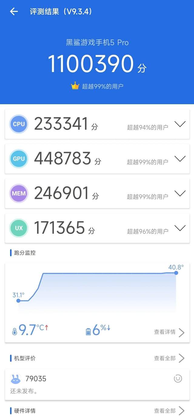查看各个子项得分就会发现,黑鲨5 Pro在CPU、GPU以及UX得分上并没有大的区别,差异最明显的就是MEM得分,高达24万的分数,相比普遍18万左右的分数高了30%以上。这一总成绩帮助黑鲨5 Pro登顶安兔兔性能榜应该是没有悬念了。