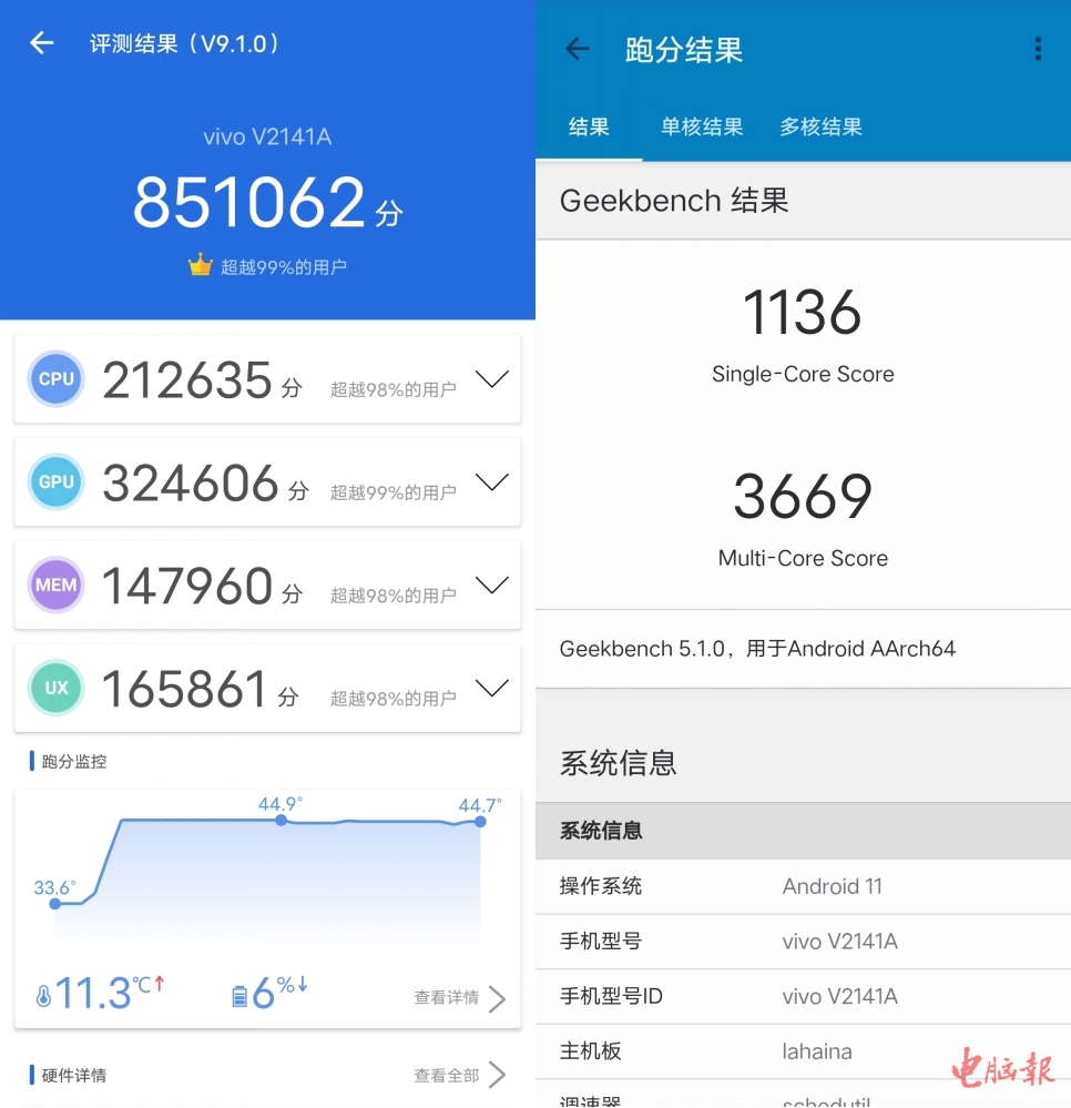 首先是安兔兔跑分,85万比我们之前评测的小米MIX 4和荣耀Magic 3 Pro都要更高,Geekbench 5的单核得分基本在1100左右,多核成绩则在3600上下,属于正常水准。