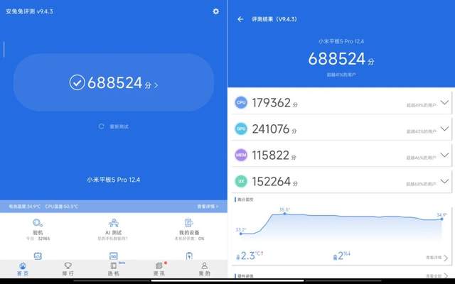 在安兔兔测试中,小米平板5 Pro 12.4跑分为688524分钟,属于骁龙870的正常水平,性能表现与11英寸版本基本一致。其实,这款平板其实完全可以放一颗性能更强的芯片,例如骁龙888,虽然这颗芯片在手机上的表现乏善可陈,但是平板有更大的散热面积,更有利于性能释放,也符合小米平板5 Pro 12.4更高的定位。