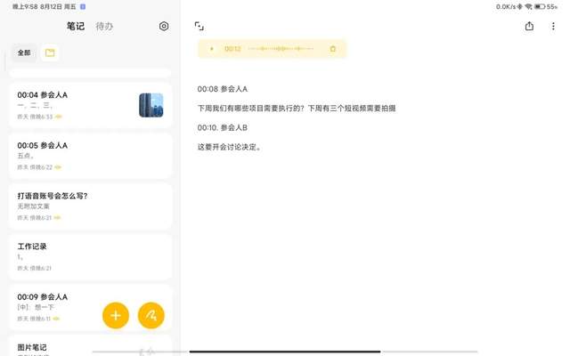 除了与手机联动实现的生产力,小米平板5 Pro 12.4本身也有针对这一属性的功能。在小米笔记的语音记录中,新增了一个会议模式,根据音色.区分讲话人,快速生成文本,支持中英互译,很适合用于记录会议纪要。甚至可以用这个功能记录电视剧,相声中的对话,把它们用文字的方式保存在笔记中。但目前该功能还属于体验版,最多仅支持4人讲话,语音识别准确性也有待提升。