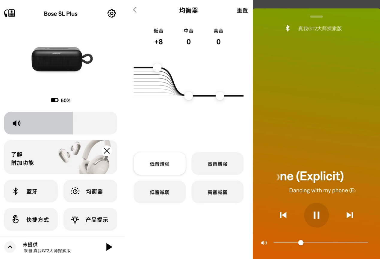 在Bose App上我们可以查看这款产品的当前电量、调节音量,也可以对三段EQ进行个性化调整。值得一提的是,这款音箱支持音量释放更加燃爆的派对模式,简单来说就是同时连接两个Bose设备,两款扬声器背对背摆放,就可以应对360°开阔场地的播放需求。