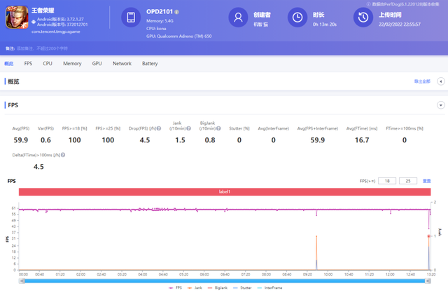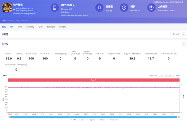 《王者荣耀》开启最高画质和帧数,OPPO Pad平均帧数59.9帧,帧数方差0.6,帧数稳定,帧数曲线基本可以保持一条直线,游戏运行平稳。