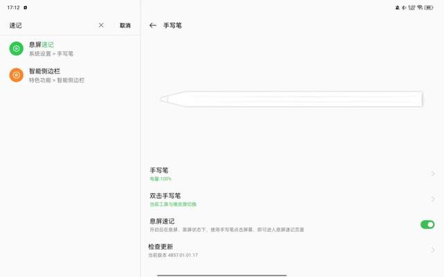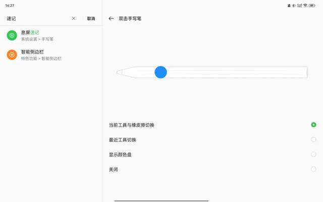 另外,双击OPPO Pencil笔身可切换橡皮、书写工具,显示颜色盘等,切换成功率很高。手写笔本身的续航还不错,一般用完之后随手吸附在平板上,基本不会出现缺电的现象。