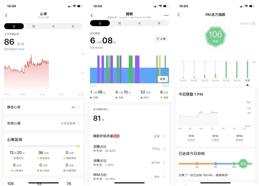 此外,Amazfit T-Rex Pro还支持24小时日常心率监测、睡眠监测、压力监测等常见的健康功能,以及还有华米产品独有的PAI健康评估系统。第一次接触华米产品的朋友可能对这个PAI指数不太了解,简单理解它就是把心率数值通过算法转化为具体的数值,让佩戴者通过简易的分数来了解自己身体健康状态。