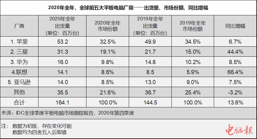 从2020年全年全球平板电脑市场的出货量来看,排名前五的平板电脑厂商分别为苹果、三星、华为、联想和亚马逊。