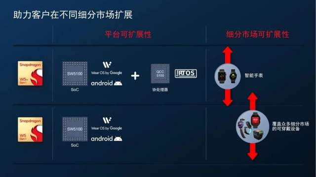 那么骁龙W5性能究竟什么水平?它可以运行《王者荣耀》这样的轻负载游戏,换句话说,这是一款能运行《王者荣耀》的智能手表。值得注意的是,骁龙W5是个系列芯片,还有一款骁龙W5+,两者最大的区别在于后者内置一颗低功耗AON协处理芯片,用于处理一些频繁使用的功能,例如对运动健康的监测。