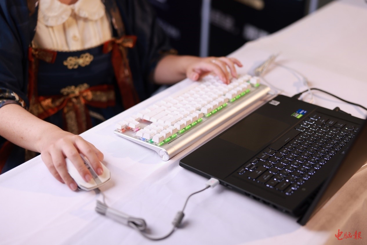 在CCG EXPO 2021的科技视讯展台上,为了搭配MX8.0、MC8.1和HC8.2,一款性能强劲、外观简约的游戏笔记本正面对着过道的人群,屏幕上是供试玩的游戏画面,已经有人迫不及待地坐在电脑前,使用MX8.0在游戏中厮杀畅玩了,等他过足了瘾再站起来,又爱不释手地抚摸了一番MX 8.0,发出感慨:“这键盘真是太棒了,我得买一个回家自己用!”