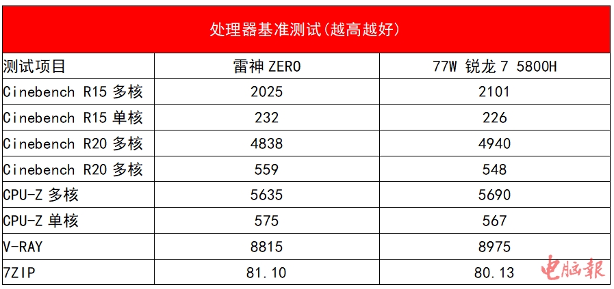 如上表所示,在Cinebench R15中,雷神ZERO处理器多核得分是2025,单核得分是232;而在Cinebench R20中,该机多核的分是4838,单核得分559。从该系列测试来看,多核性能和77W款锐龙7 5800H非常接近,单核性能甚至有所反超。