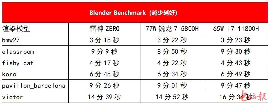 同样的还有CPU-Z和V-RAY基准测试,雷神ZERO的65W款锐龙7 5800H和77W款多核性能十分接近,而有趣的是,在7ZIP基准测试中,雷神ZERO还稍微领先了点儿。那么,在较长时间的满载中,具体情况又是怎么样?这次牛叔又加入了65W的款i7 11800H一起来参加PK,测试项目选择的是Blender六个场景连续渲染,测试结果如下所示。
