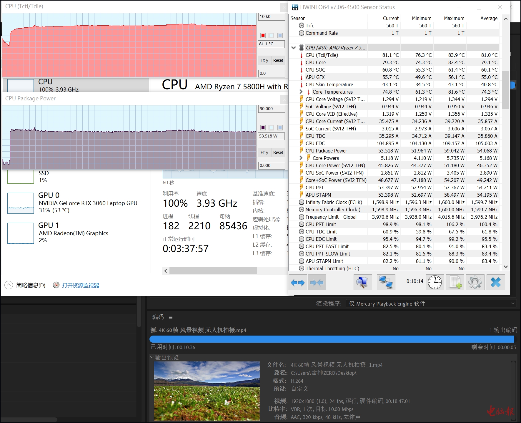 ▲MECC视频转码测试,处理器方案,独显辅助计算。从监控看到,锐龙7 5800H的功率可维持在55W左右,频率3.9GHz,总耗时为10分41秒,效率较高。在锐龙7 4800H时代,视频转码需要14分钟左右。